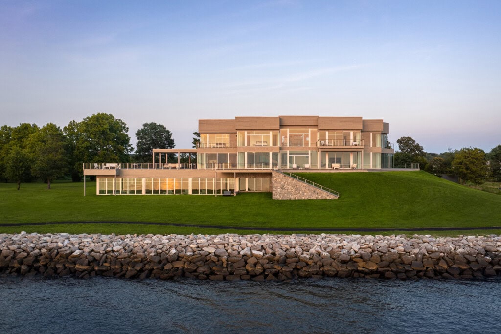 Hoch auf einer Klippe gelegen, mit Blick auf das ruhige, silberne Wasser der Chesapeake Bay, wurde diese Residenz in Maryland als Ort der Ruhe und der engen Verbundenheit mit der Natur konzipiert. Das Design ist von den wechselnden Farbtönen von Meer und Himmel inspiriert. Jeder Sonnenaufgang taucht den Horizont in Gold, jeder Abend klingt in ruhigen Blautönen aus.