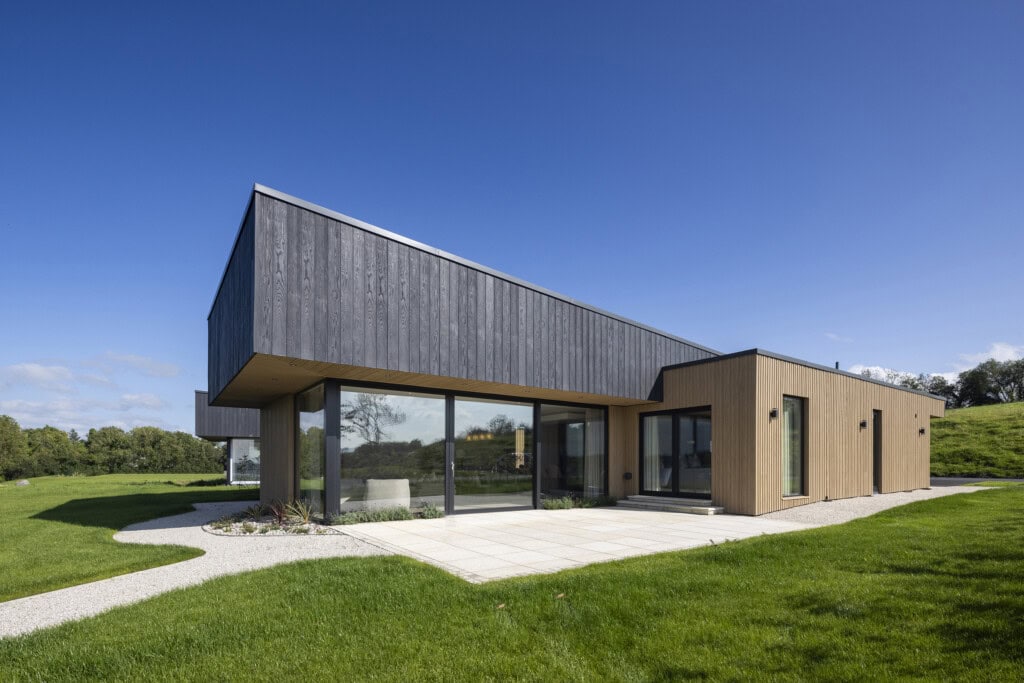 Envello Board & Batten+ in Golden Oak wurde aufgrund seines warmen, einladenden Farbtons ausgewählt, der die natürliche Landschaft von Fermanagh ergänzt und eine nahtlose Verbindung zwischen den Ferienhäusern und ihrer Umgebung schafft.