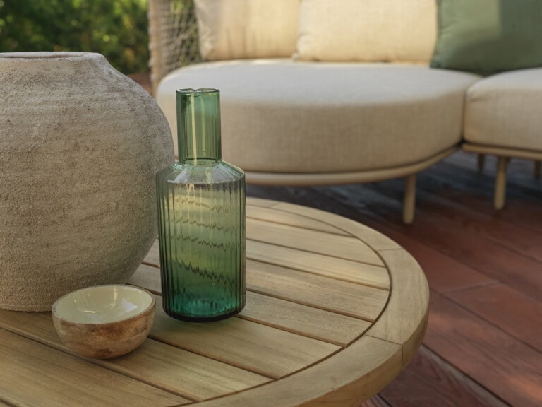 Erwägen Sie, Ihren Terrassenbereich mit einem kleinen Springbrunnen oder einem sprudelnden Wasserelement zu versehen. Das beruhigende Plätschern von fließendem Wasser kann Sie an einen ruhigen Urlaubsort versetzen. Das Geräusch von Wasser kann unglaublich beruhigend und erfrischend sein.