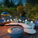 The two circular decks were designed not only as viewing platforms for the Acer garden, but as generous entertaining spaces. The upper level is furnished with fully upholstered outdoor sofas and bespoke cushions, grouped around a sculptural fire bowl that becomes a natural focal point on cooler evenings. A large cantilever patio heater and layers of decorative garden lighting mean the space can be enjoyed long after sunset, with the Millboard decking providing a stable, comfortable underfoot surface.