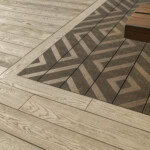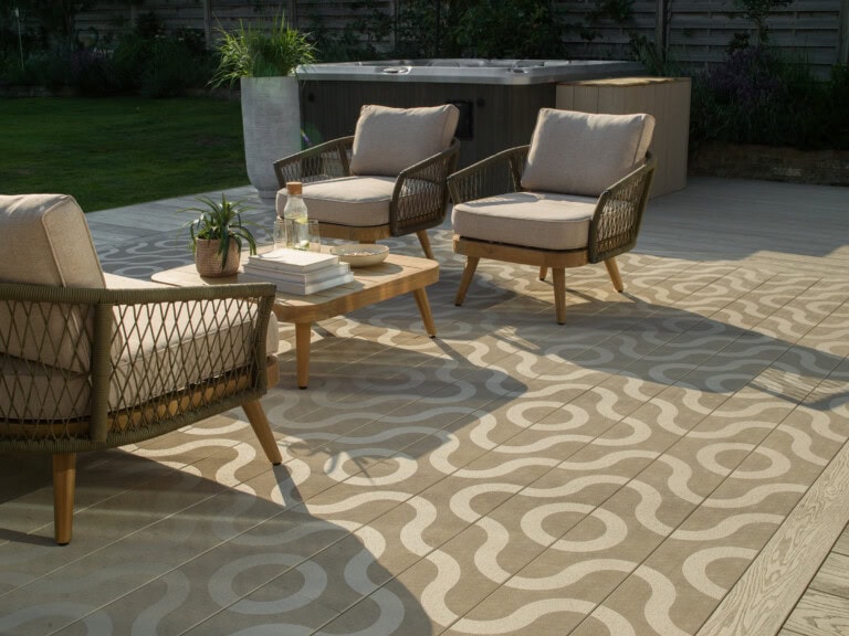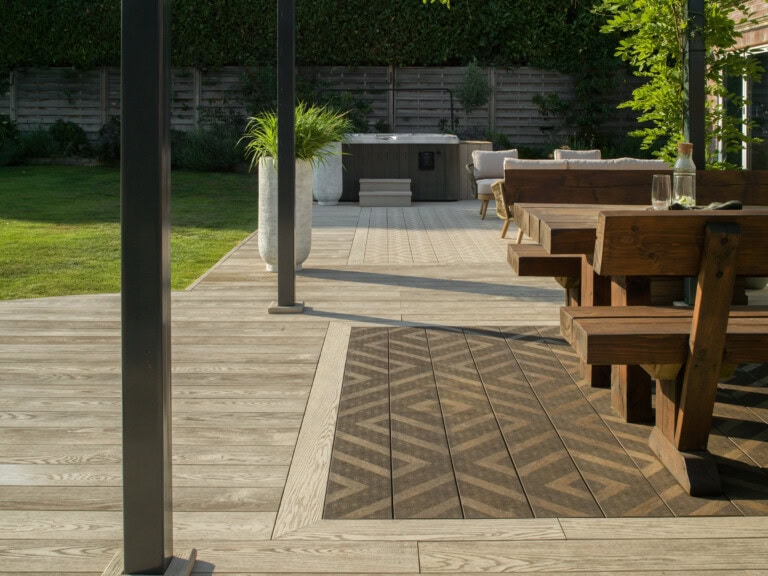 To make the most of the space, the garden was designed with distinct zones – a sociable dining area, an outdoor kitchen, peaceful reading nook, and a safe play space for the children. While the main area features Enhanced Grain in Limed Oak, a special element was added at the heart of the design: an inset Modello Contour area in the same Limed Oak tone and Modello Linear in Antique Oak.