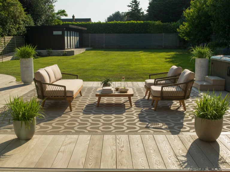 The Contour Garden Transformation blending beauty and ease of maintenance with Millboard’s Modello Contour, Linear and Enhanced Grain decking in Limed Oak and Antique Oak.