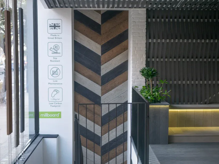 Thanks to the waterproof qualities of the boards, a water feature made from Millboard products creates a beautifully modern centrepiece that would not normally be viable with traditional timber. Pictured is the example from our London showroom, which you can visit here.