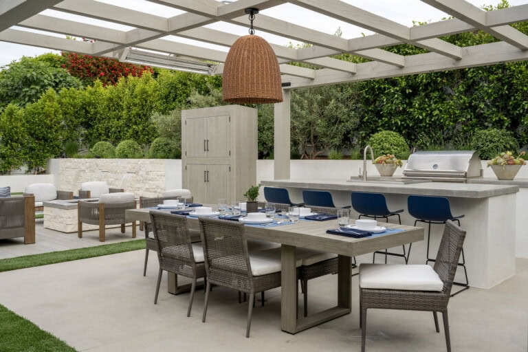 In the sun-drenched neighbourhood of Newport Beach’s Port Streets, designer Emily Martin was presented with the opportunity to transform her client’s backyard into a luxurious outdoor oasis. Known for her refined design style influenced by global travels and an eye for blending functionality with beauty, Emily took on the challenge of designing an exterior space that was not only stunning but also low-maintenance, and highly durable.