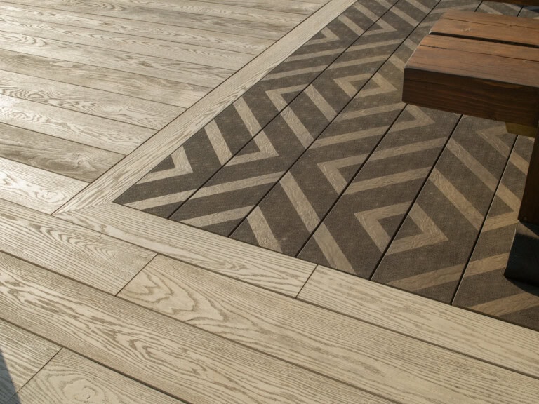 To make the most of the space, the garden was designed with distinct zones – a sociable dining area, an outdoor kitchen, peaceful reading nook, and a safe play space for the children. While the main area features Enhanced Grain in Limed Oak, a special element was added at the heart of the design: an inset Modello Contour area in the same Limed Oak tone and Modello Linear in Antique Oak.
