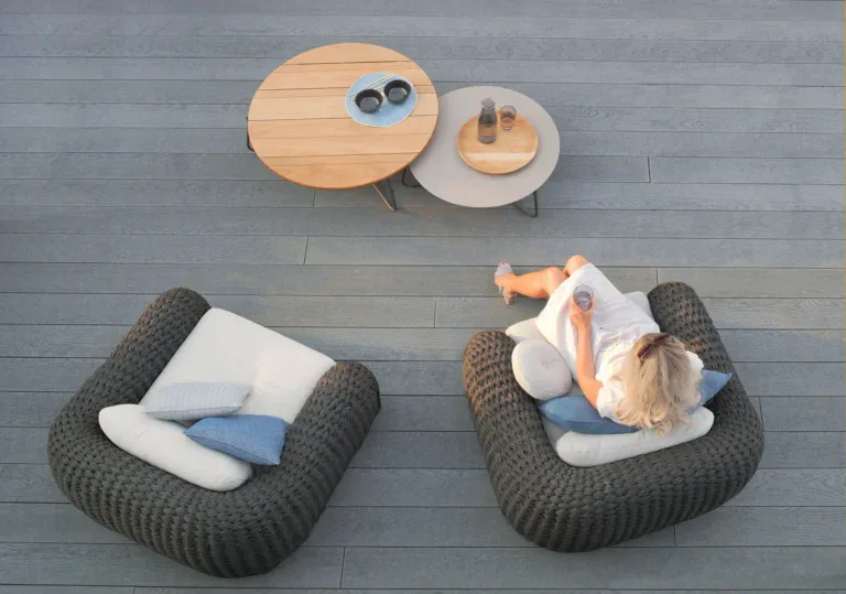 For furniture, we love the Manutti Kobo chairs, a chunky, robust chair that is comfortable and offers a fantastic centre piece. The curved lines bring a touch of modernity to your decking, whilst the hand-woven rope ties back to a traditional feel, much like the modern yet traditional feel of the Enhanced Grain range.