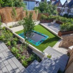 - Overlapping steps, also finished in Millboard, link the lawn to a sunken trampoline – a clever solution that turns a safety concern into a family-friendly feature.
