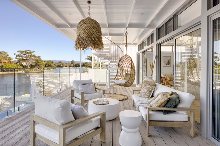 Design cohesion is key. Choose a colour palette that reflects or complements your interior. Consider warm neutrals, deep greens or earthy rusts, and carry it through your outdoor textiles, planters, and parasols.
