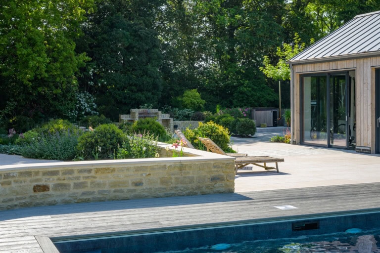 The garden now connects the main house, pool house and gym with a clear visual language. Limestone paving leads you naturally from one area to another, while the Millboard decking around the pool forms a warm, social heart to the scheme. Each space offers its own character, yet the overall feel is one of calm continuity.