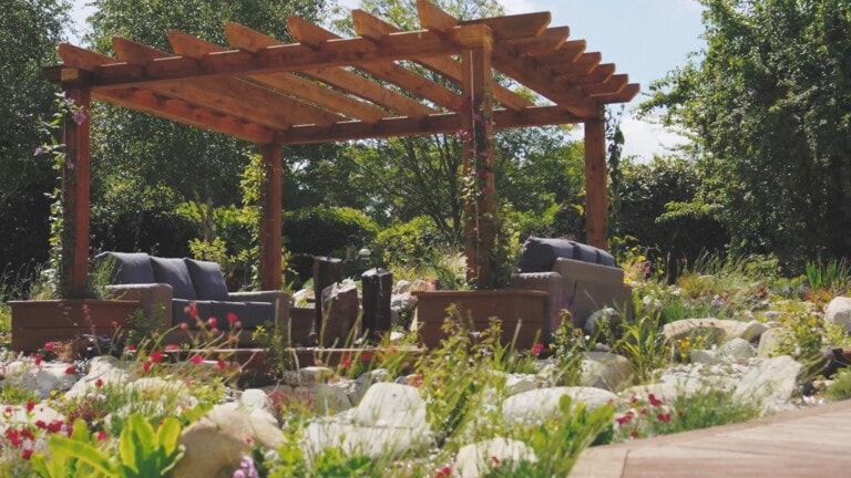 To enhance the sense of immersion, Millboard planters have been built around each leg of the pergola. These provide anchored points for climbers to twist, climb and eventually drape overhead, softening the structure and pulling even more greenery into the seating area.
