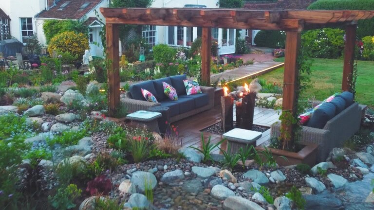 The homeowners wanted more than a simple seating area. Their brief called for a calm, contemplative space with a bespoke waterfall network, interlinked ponds, a striking pergola and a raised walkway leading to their summer house. It needed to be visually dramatic, yet genuinely usable day to night and across the seasons.