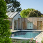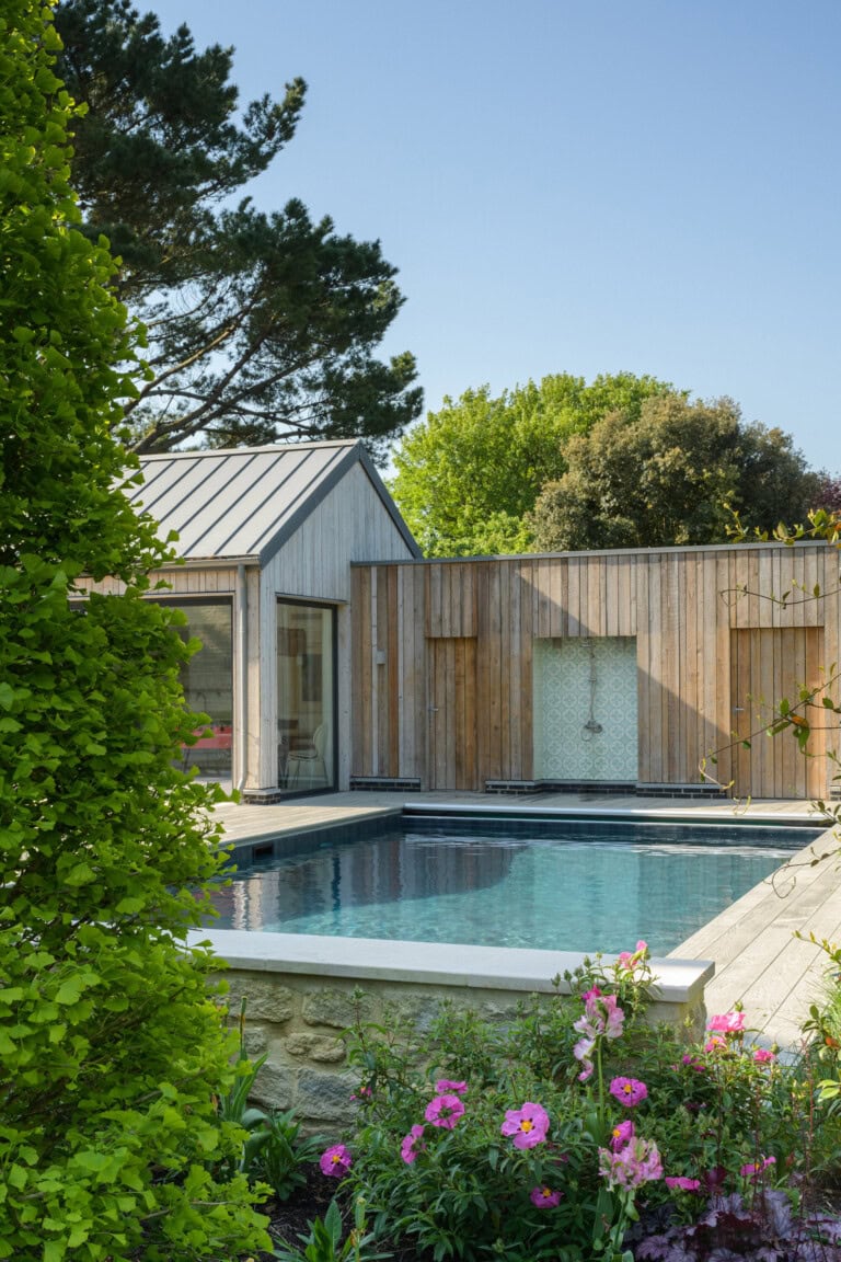 Au sein de ce dialogue entre pierre et bois, la terrasse Millboard a été utilisée pour apporter une dimension tactile et naturelle aux espaces autour de la piscine.