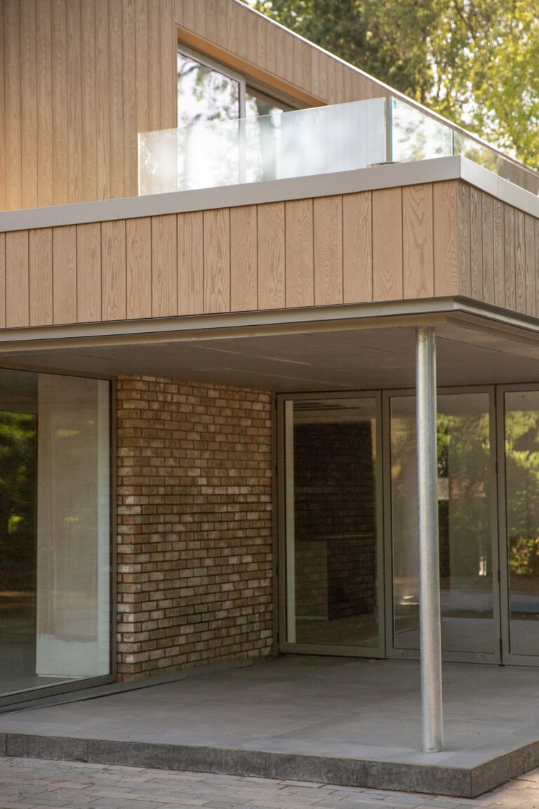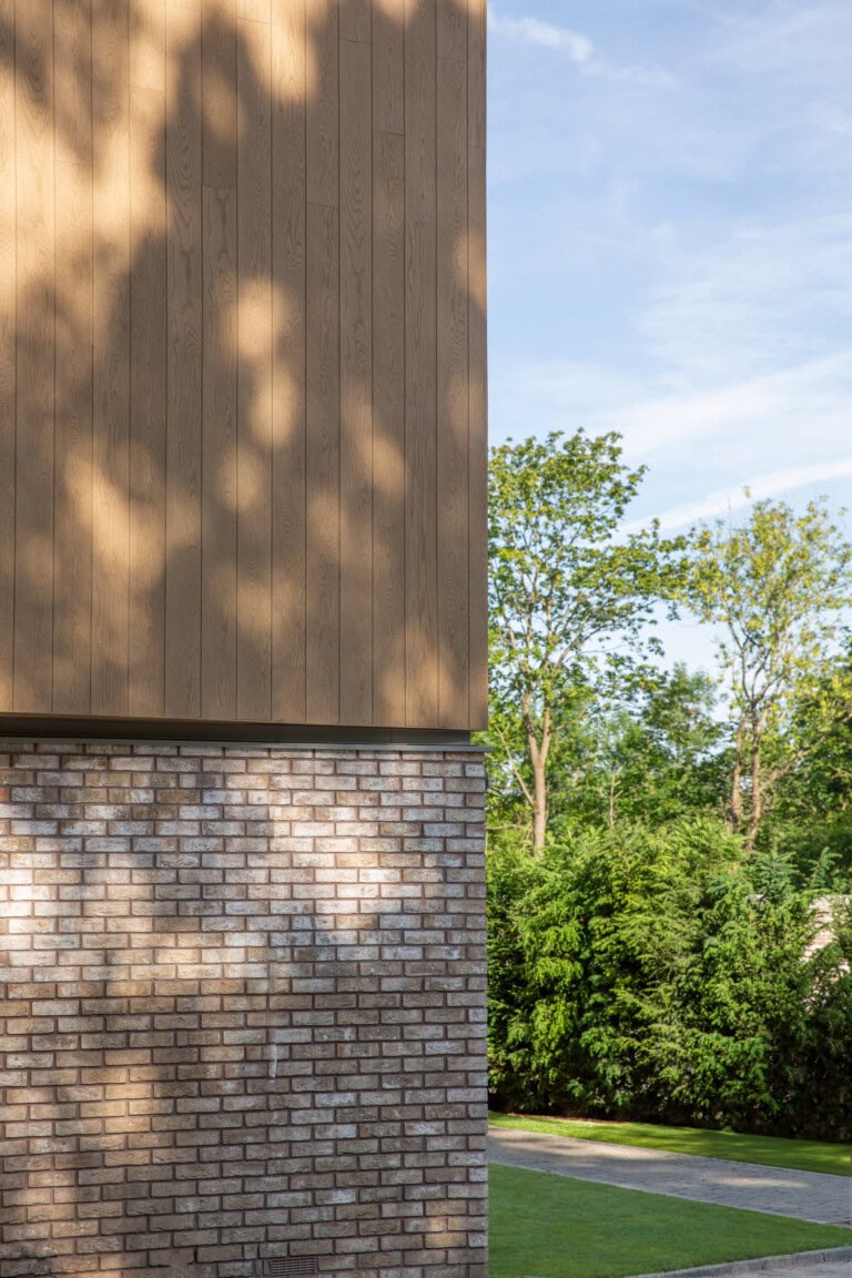 Pour répondre à ces exigences esthétiques et techniques, Altin Homes a choisi le bardage composite en résine minérale Millboard Envello Shadow Line+, en Chêne Doré et Cèdre Brûlé, associé à un parement de briques soigneusement sélectionné au rez-de-chaussée.