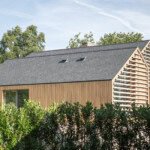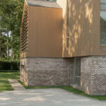 Chaque maison, sur deux niveaux et dotée de cinq chambres, est conçue individuellement tout en appartenant clairement à une même famille architecturale, caractérisée par de fortes lignes horizontales, de larges surfaces vitrées et un assemblage de matériaux soigneusement équilibré.
