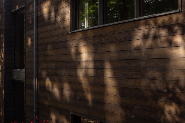 L’un des choix les plus importants du projet de rénovation a concerné les matériaux extérieurs. Le bardage d’origine, en chêne naturel, avait beaucoup de caractère mais nécessitait un entretien conséquent. Tous les deux ou trois ans, il fallait le poncer et le retraiter pour conserver son aspect. Une opération longue, salissante, et peu compatible avec le style de vie recherché par les propriétaires.