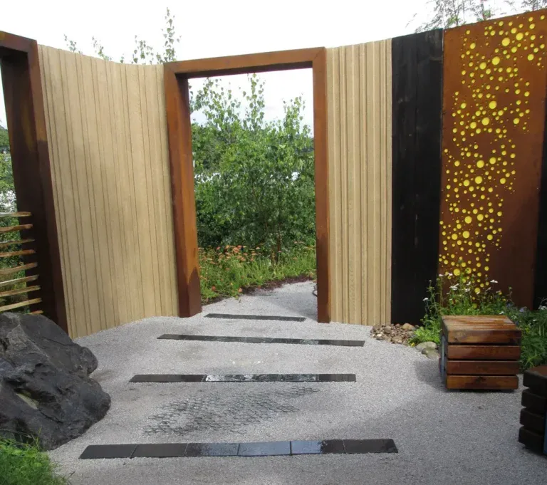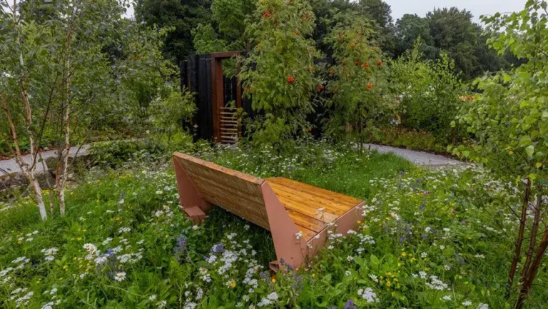 Au cœur de cette installation se trouve l’Inner Sanctuary, véritable sanctuaire du jardin. L’un des murs intègre un panneau métallique percé de 507 trous numérotés, représentant le nombre tragique de suicides en 2021. Cet espace paisible, ponctué de poches de fleurs sauvages, a été conçu comme un refuge sûr et intime, propice au calme et au recueillement. Le bardage Envello Board & Batten+ en Chêne Doré de Millboard y offre un décor remarquable, capturant l’esthétique du bois naturel tout en garantissant une durabilité et une longévité exceptionnelles.