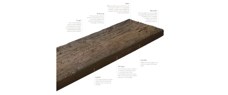 Millboard decking stands out as a unique, high-performance material that redefines outdoor living. Unlike traditional timber, Millboard offers the aesthetic appeal of natural wood without its inherent weaknesses. Let’s take a closer look at its innovative construction and superior performance.