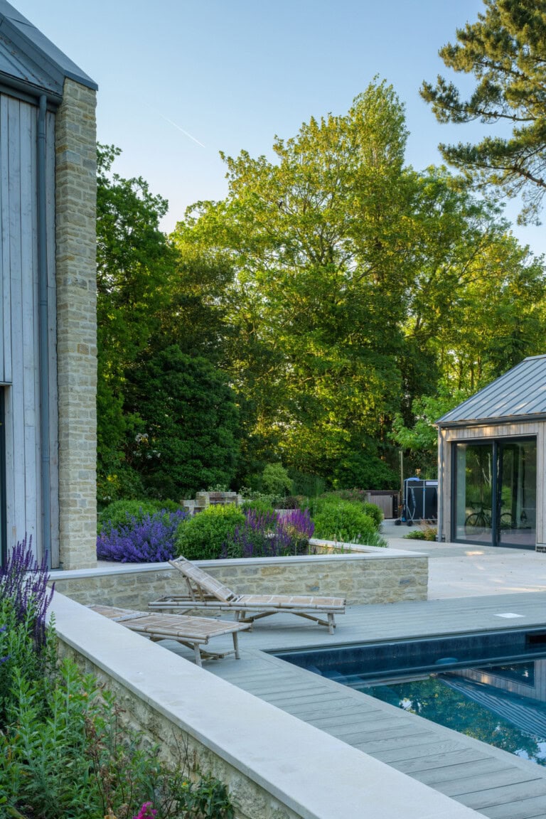 Au sein de ce dialogue entre pierre et bois, la terrasse Millboard a été utilisée pour apporter une dimension tactile et naturelle aux espaces autour de la piscine.