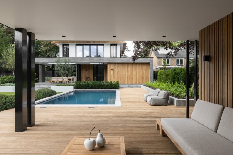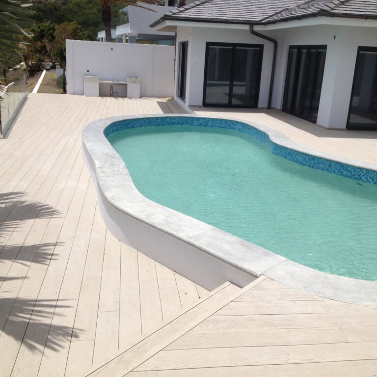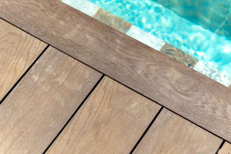 Millboard s’intègre parfaitement à ces compositions. Sa flexibilité permet des tracés courbes, l’intégration d’éclairages, des assises encastrées ou des plateformes surélevées. Les lames peuvent être coupées, ajustées et finies avec précision, même autour de piscines aux formes irrégulières ou de terrasses à plusieurs niveaux.