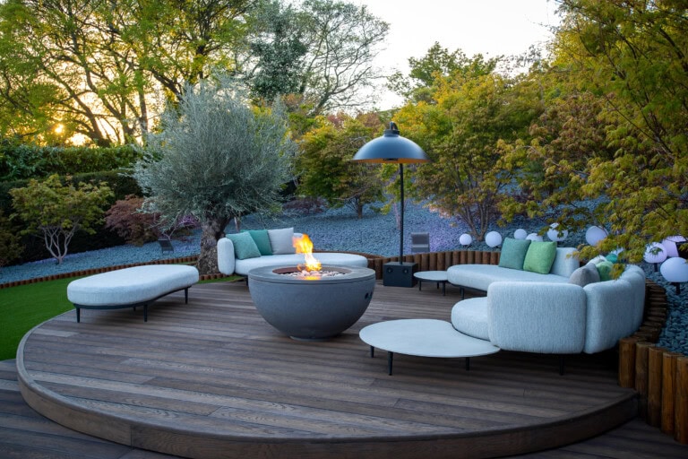 The two circular decks were designed not only as viewing platforms for the Acer garden, but as generous entertaining spaces. The upper level is furnished with fully upholstered outdoor sofas and bespoke cushions, grouped around a sculptural fire bowl that becomes a natural focal point on cooler evenings. A large cantilever patio heater and layers of decorative garden lighting mean the space can be enjoyed long after sunset, with the Millboard decking providing a stable, comfortable underfoot surface.