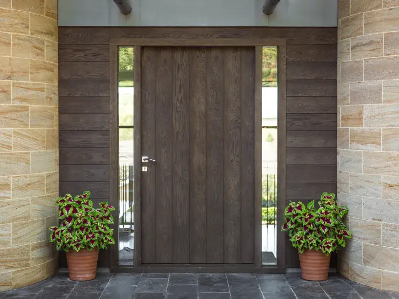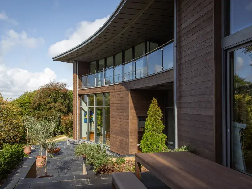 But the owners have gone further still. They’ve used Millboard products to create bespoke outdoor furniture, tables, benches, and seating areas that tie seamlessly into the overall design. Even the front door benefits from the same material, creating a cohesive look throughout the property.
