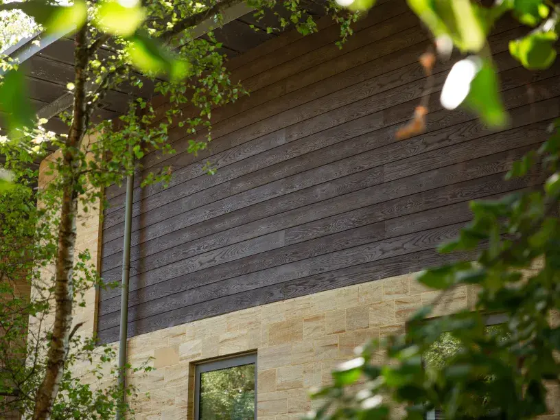 The renovation thoughtfully combines classic Somerset character with contemporary design choices. The property’s stonework a warm, creamy Ham stone sourced just outside Yeovil, provides a beautifully traditional backdrop. Against this, the deep, warm tones of Millboard’s Shadow Line+ cladding and Enhanced Grain decking in Antique Oak create a striking yet harmonious contrast.